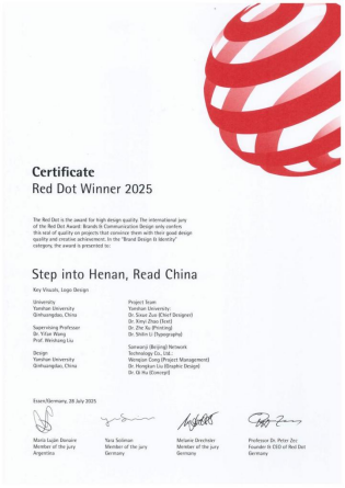 Recently, the winners of the globally renowned design competition “Red Dot Award: Brands & Communication Design 2025” were officially announced. The main visual and logo design of Step into Henan, Read China, created by a student team including Zuo Sixue under the guidance of Wang Yifan and Liu Weishang from the School of Arts and Design, stood out among numerous entries worldwide and won the Red Dot Award: Brands & Communication Design 2025. This marks the second consecutive year that YSU has received the award, highlighting its sustained recognition by international authorities for excellence in design innovation and international influence.